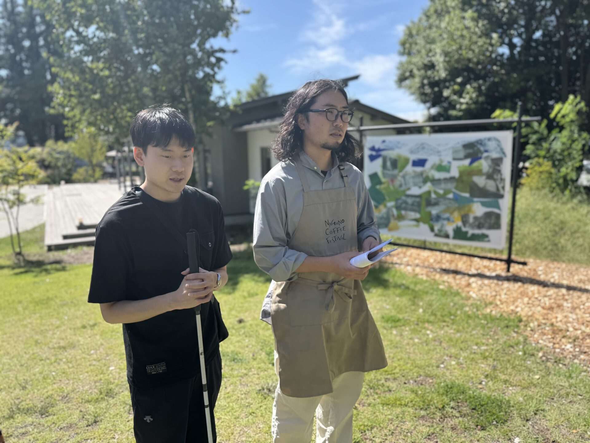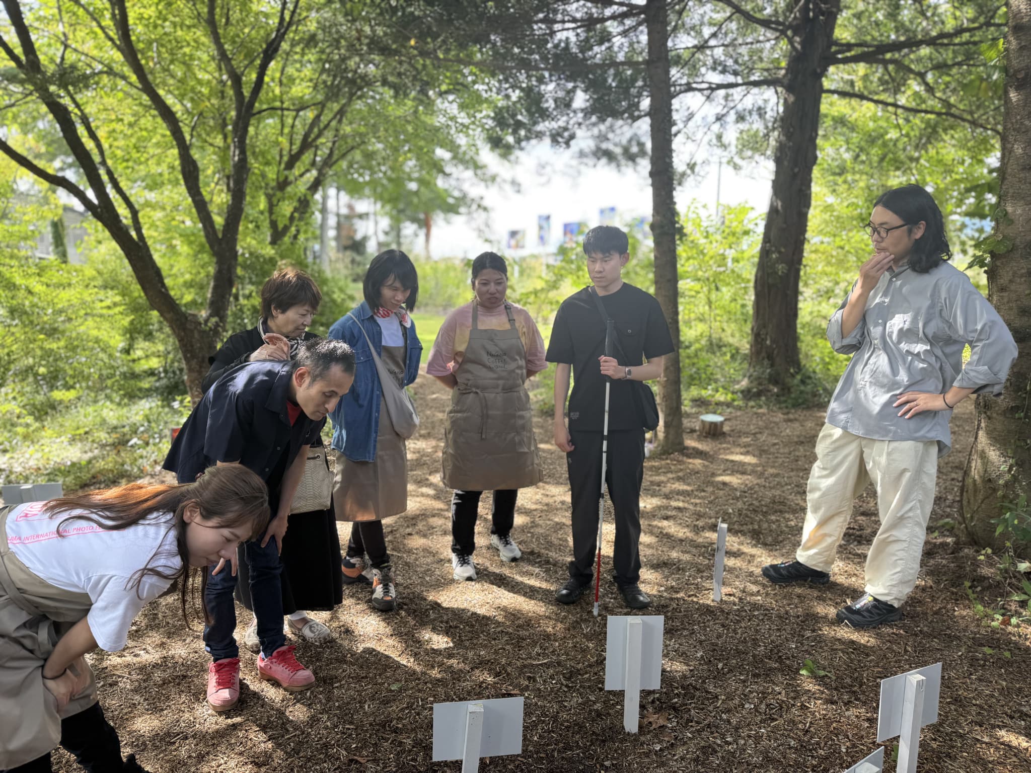 花壇の中に、高さ1メートルほどのパネルが複数設置されている。参加者全員で作品の周りにあつまり、見えている人がそれぞれの言葉で作品を説明していった。