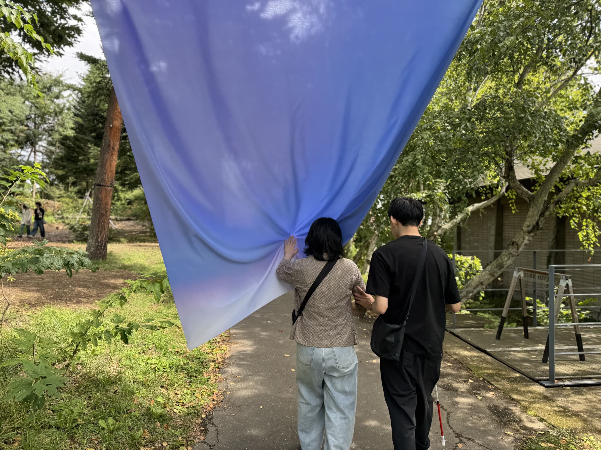 御代田の自然と一体化する巨大な構造物、地面から生えているような小さな作品、風に揺れる半透明の布、トンネル状の展示、鉄骨の構造体に貼られた巨大な写真。ここでは、額縁に収まった「写真」だけが展示されているわけではない。
