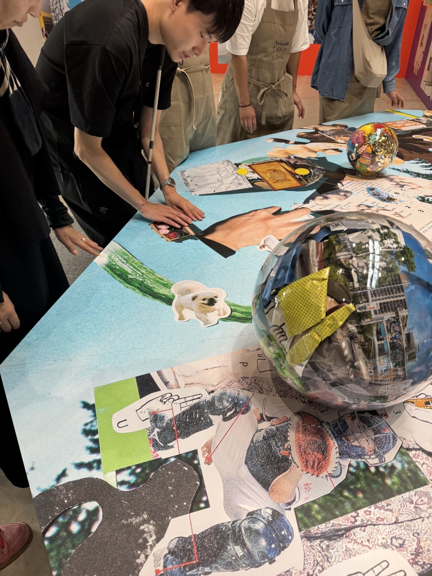 テーブルの上の球体《イメージボール》には、作家たちが世界各地で集めた素材がコラージュされている。今回は特別に触れてよい許可を得て、参加者全員で円になり、手触りを確かめながら鑑賞した。